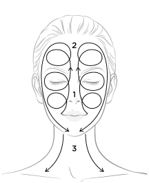 ・口元、頬、1 目元、額、首全体に広げながらなじませます。