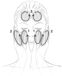 ・頬(内側)→頬(外側)→額の順に、それぞれ四指を当てたまま円を描くように動かした後、軽く押します。(左右同時に2~3セット)